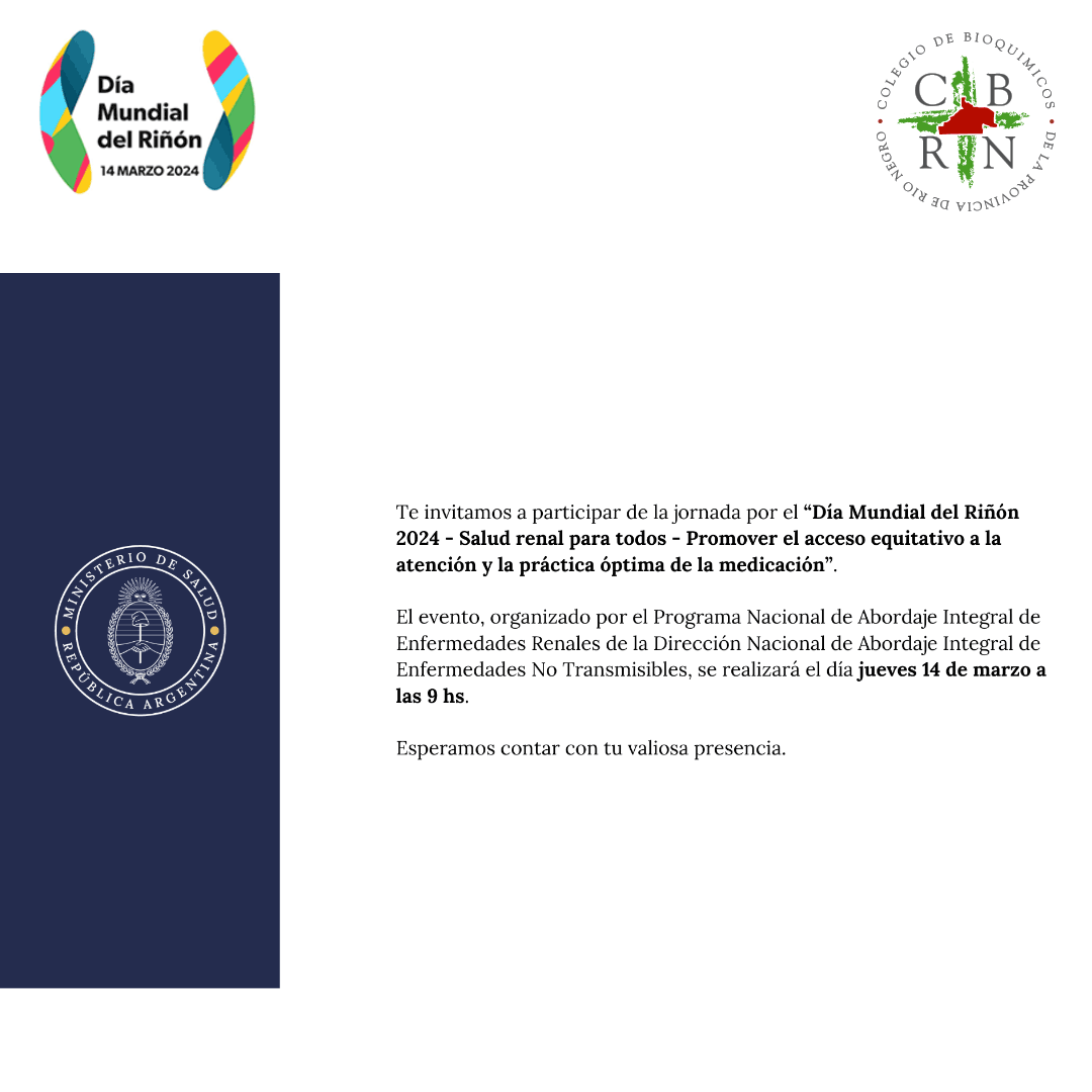 Tenemos el agrado de contactarnos con ustedes desde el Programa Nacional de Abordaje Integral de Enfermedades Renales para invitarlos a celebrar el “Día Mundial del Riñón” el jueves 14 de marzo de 2024 a las 9 hs.